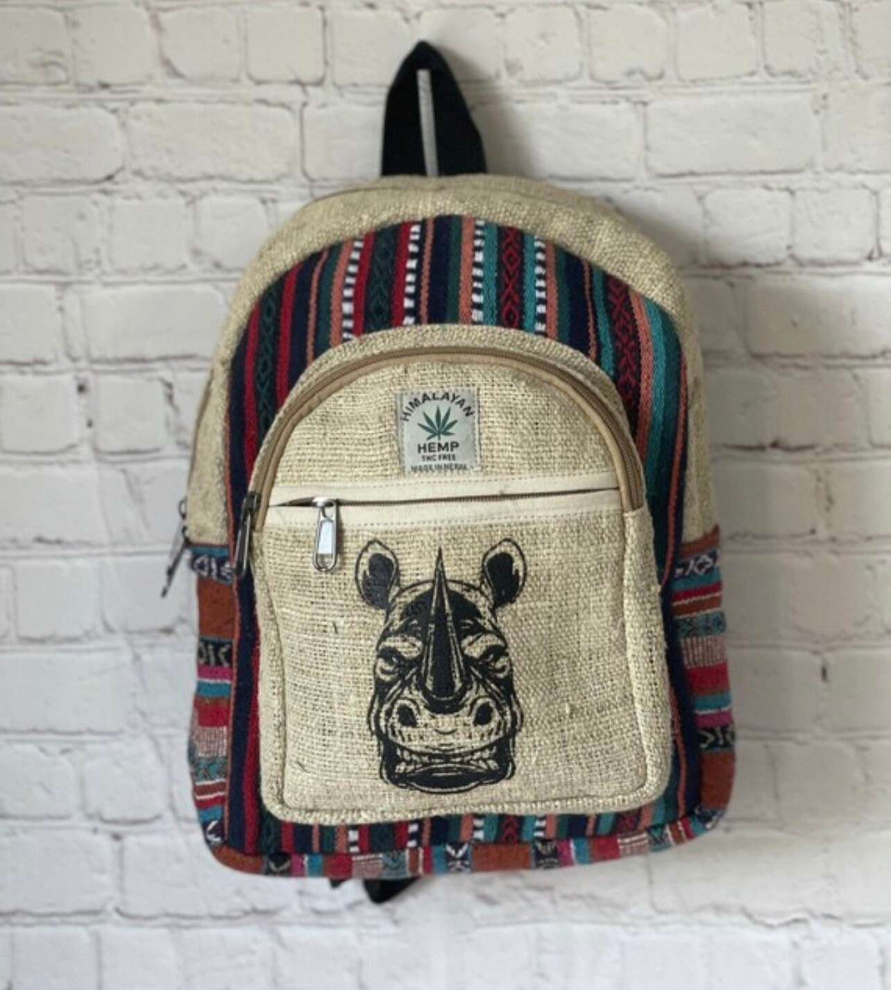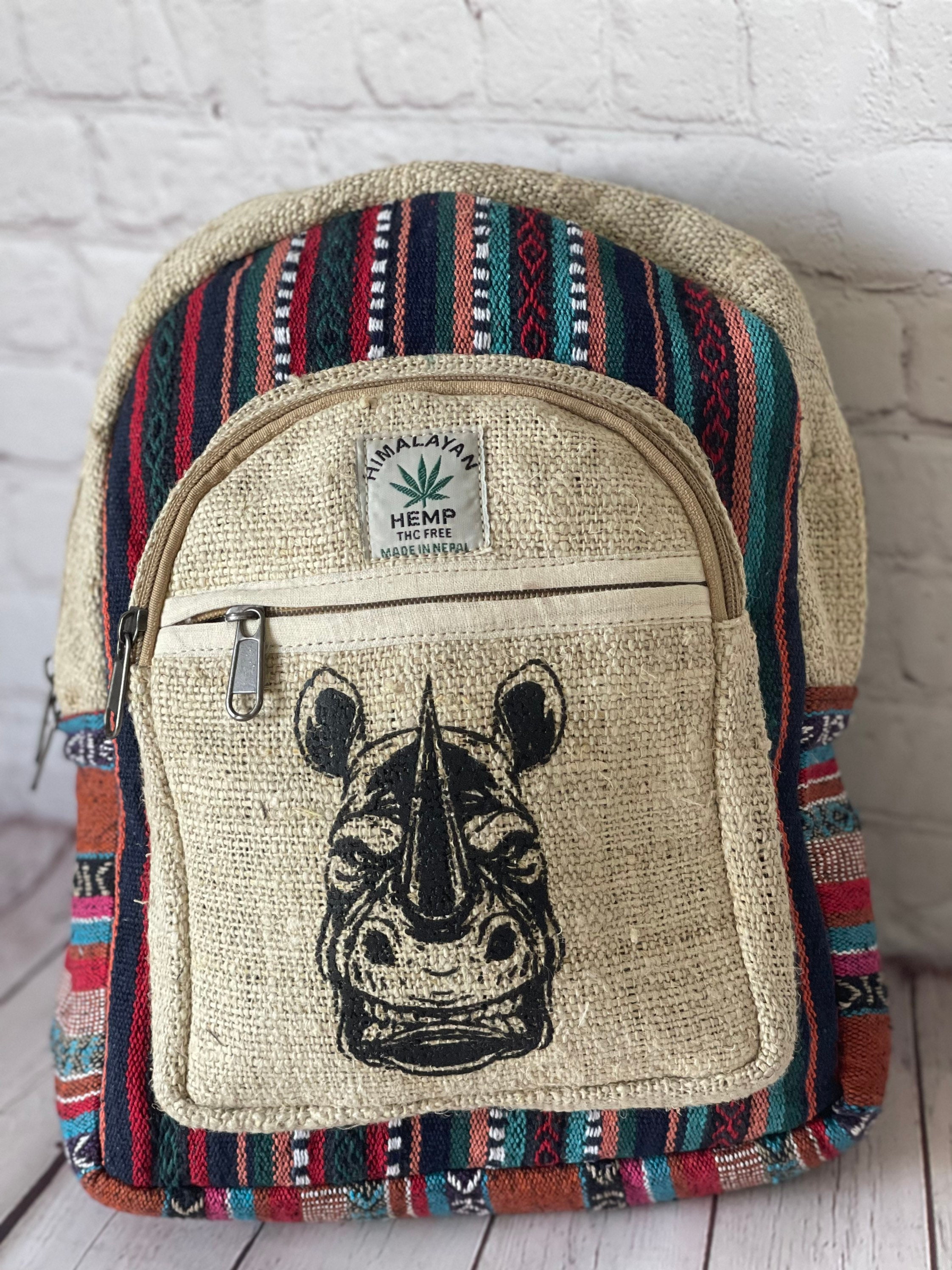This unisex, high quality, Rhinoceros printed Mini THC FREE Hemp Bagpack features all different & unique multi color panels trimmed in Natural color Hemp Fabric. It is an ethical, sustainable, eco-friendly alternative to synthetic and leather backpacks, featuring 100% wild hemp exterior lined with heavy duty cotton ,all unique in its own way .