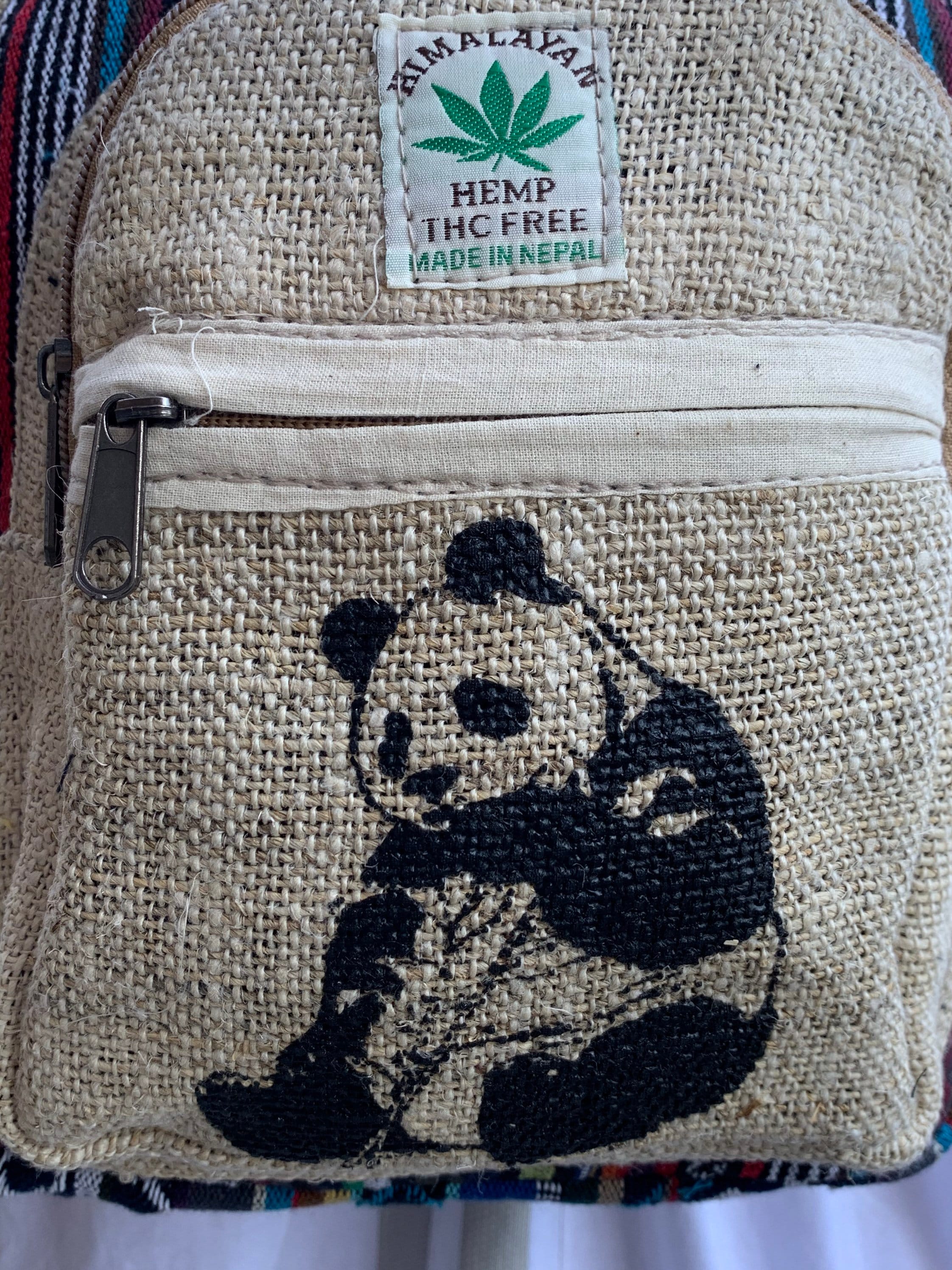 This unisex, high quality,Panda printed Mini THC FREE hemp backpack features features all different & multi color panels trimmed in Natural color Hemp Fabric. It is an ethical, sustainable, eco-friendly alternative to synthetic and leather backpacks, featuring 100% wild hemp exterior lined with heavy duty cotton ,all unique in its own way .