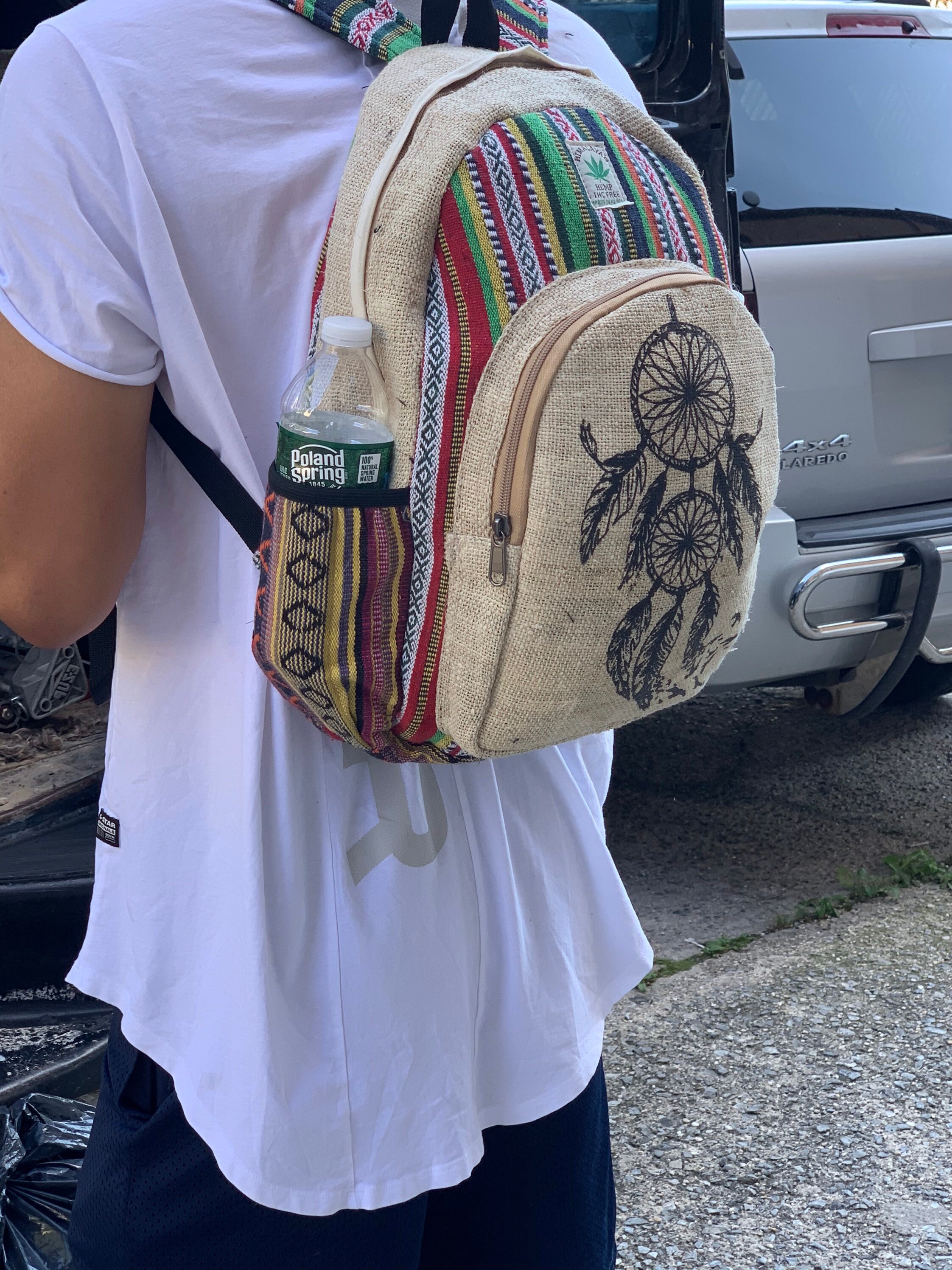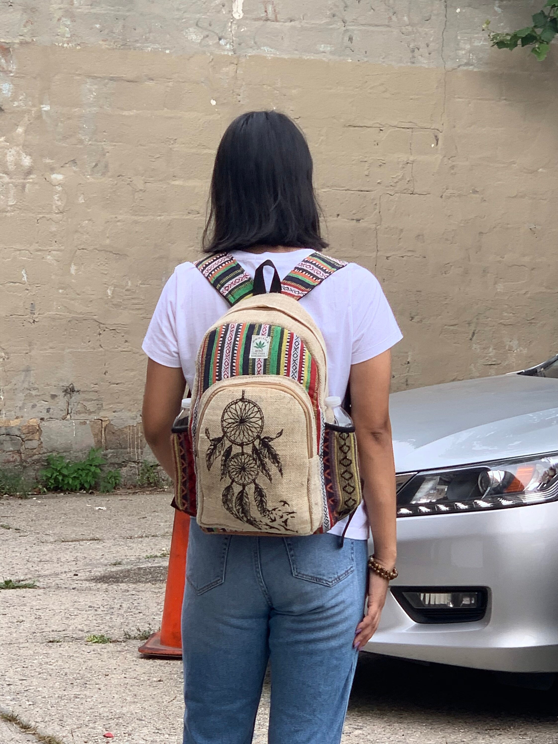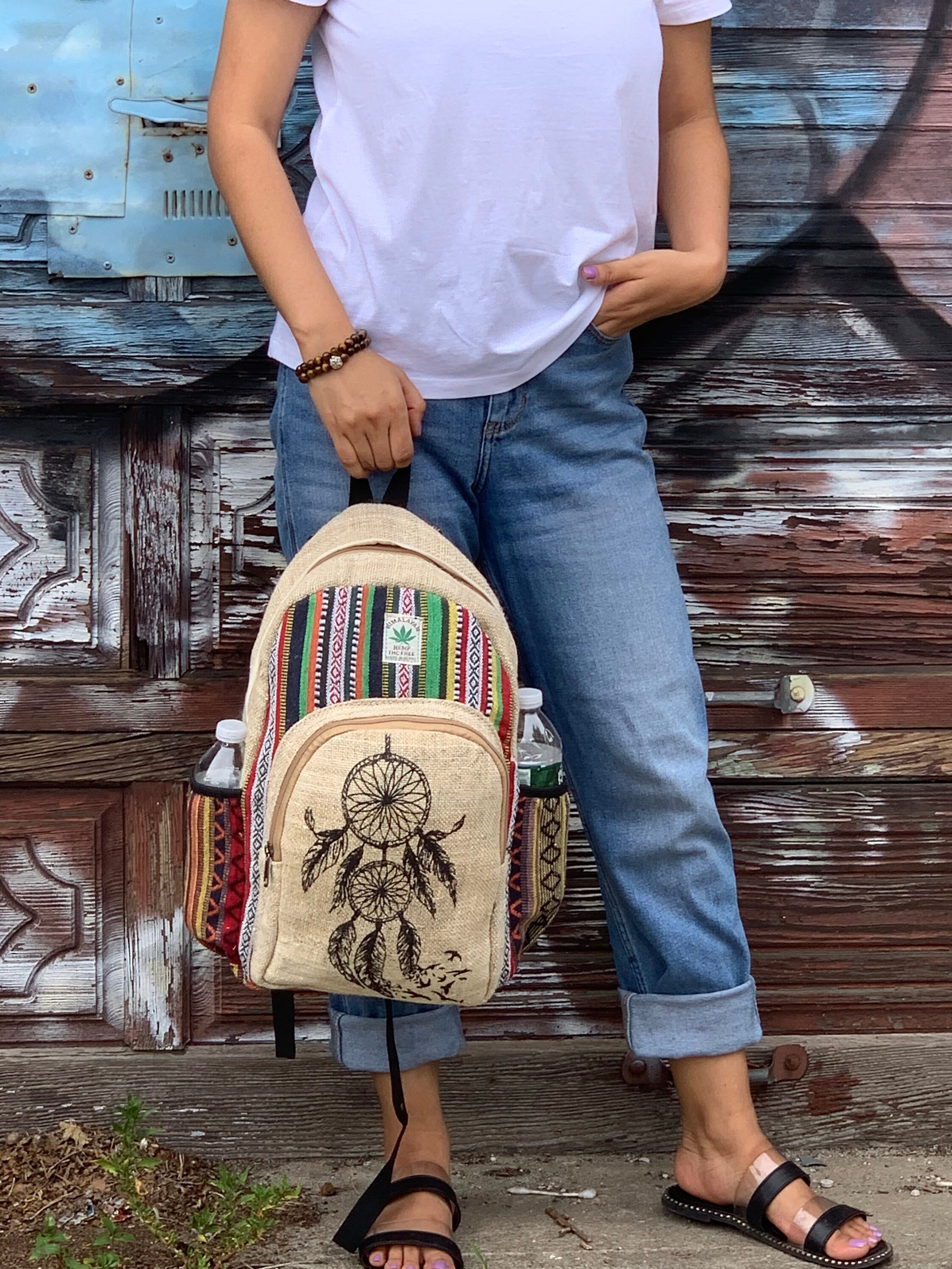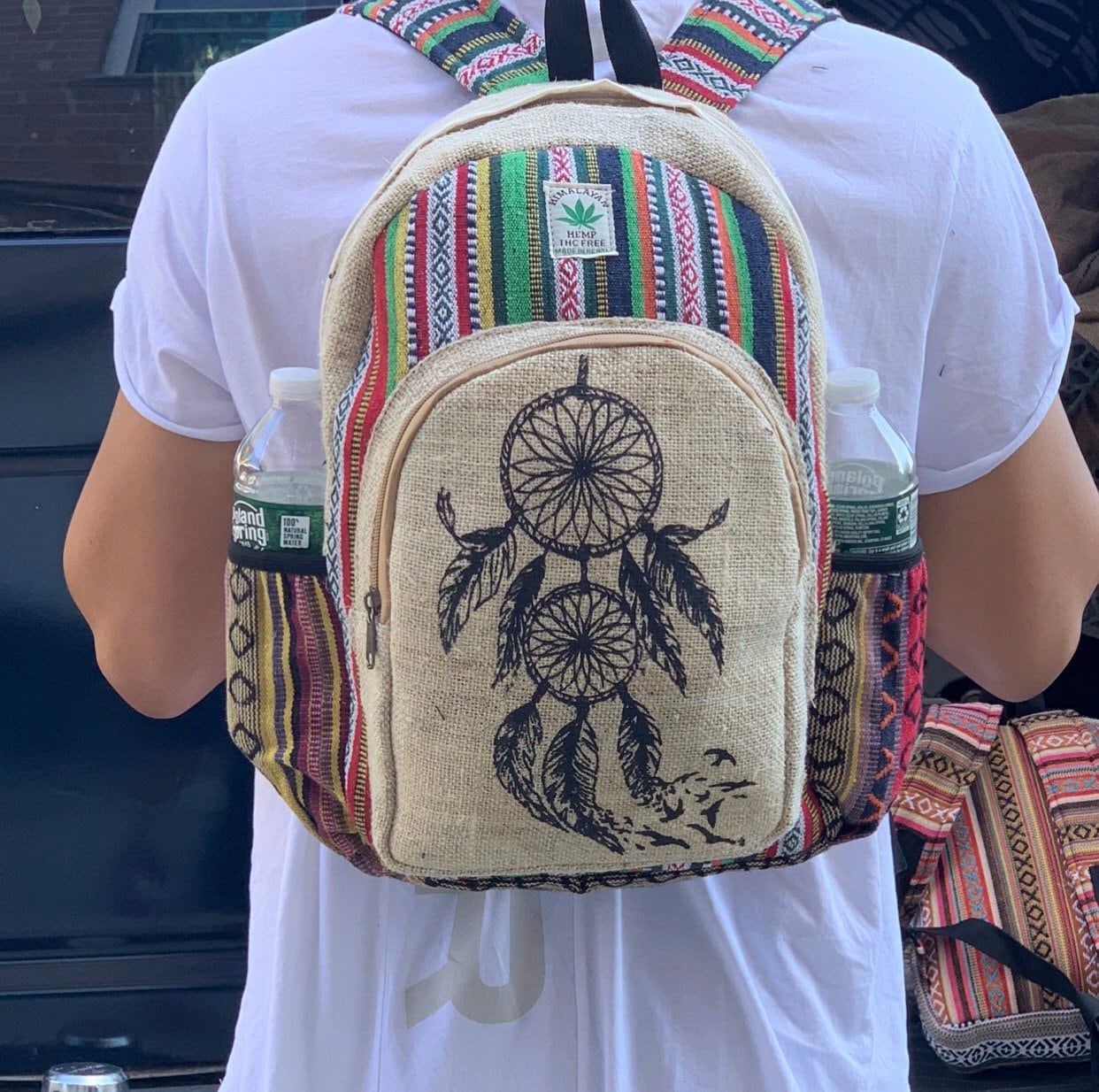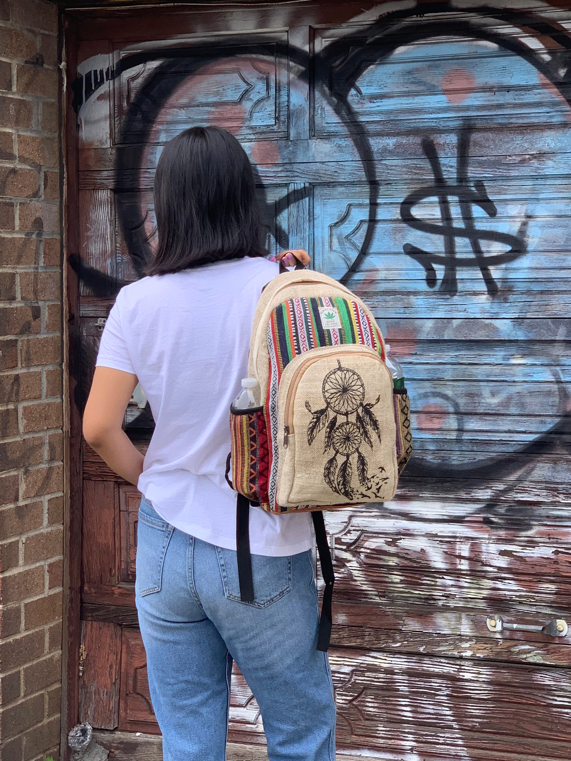 This unisex, high quality, Dream catcher printed THC FREE hemp backpack features all different & unique multi color panels trimmed in Natural color Hemp Fabric. It is an ethical, sustainable, eco-friendly alternative to synthetic and leather backpacks, featuring 100% wild hemp exterior lined with heavy duty cotton.